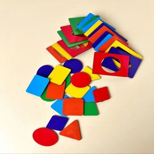 У коробочці: 18 дощечок із отворами різної форми. Запропонуйте малюкові знайти кожній фігурі свій "будиночок-рамочку". Зверніть увагу дитини на те, що кожна фігура повинна збігтися з потрібним "будиночком" не лише за формою, а й за кольором. Повторюйте назви всіх фігур, таким чином малюк запамʼятає їх легко та швидко. Знайдіть з дитиною однакові вкадиші, порахуйте їх.