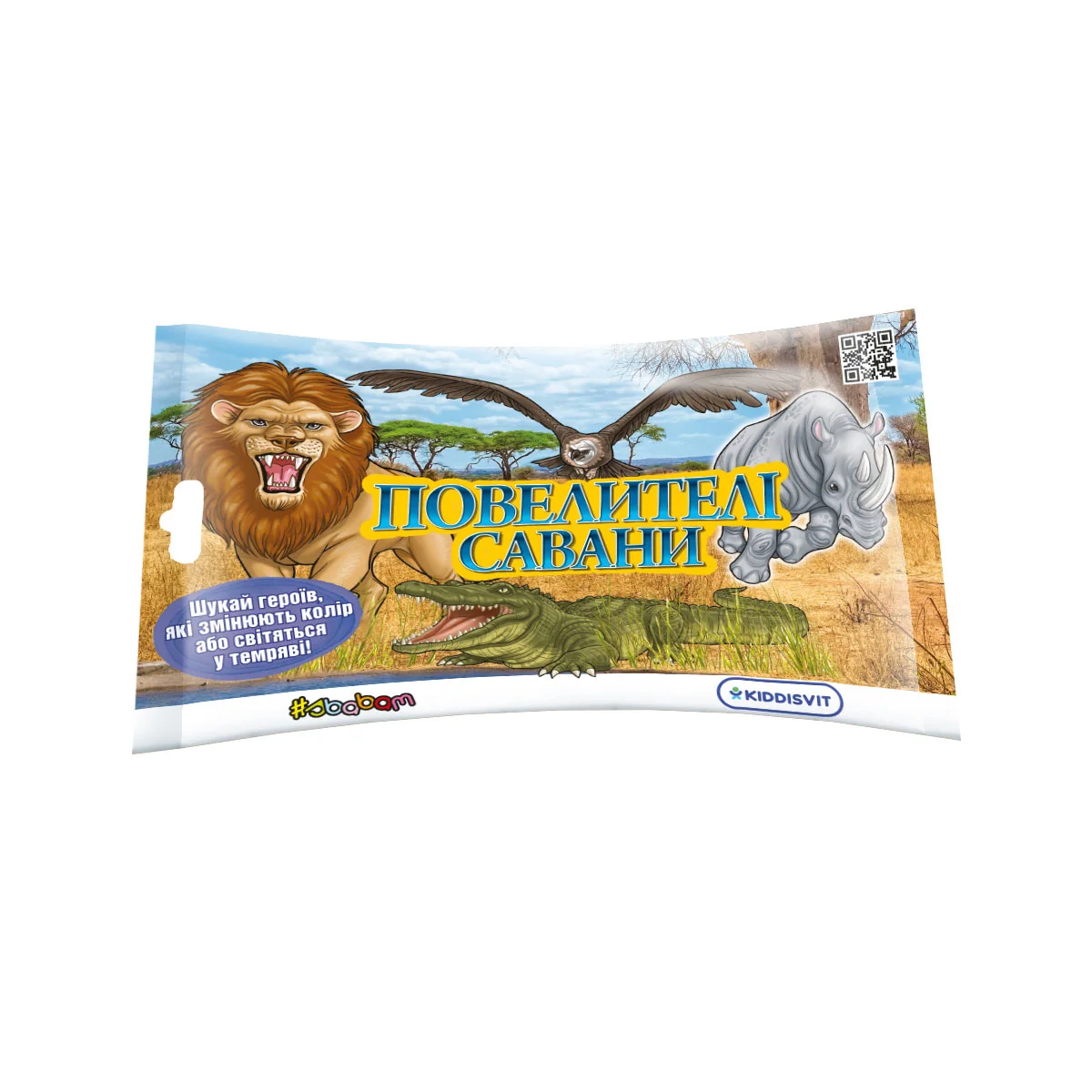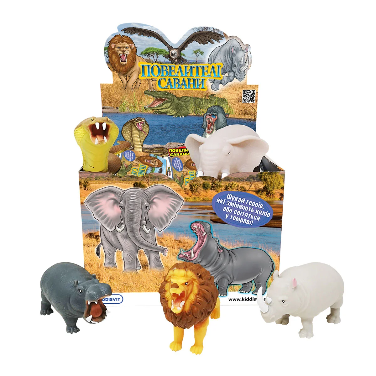 Вирушайте в подорож разом із Повелителями савани, щоб відкрити для себе великого африканського слона та короля савани – лева. Спостерігайте за бегемотом і стережіться носорога. Дізнайтеся, які з них змінюють колір чи світяться у темряві! Зберіть їх усі!