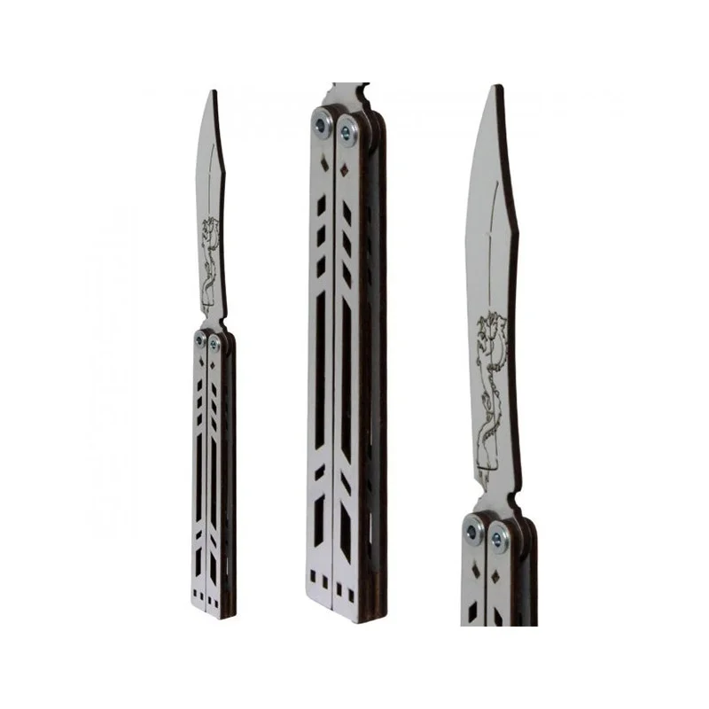 Ніж сувенірний – метелик. Матеріал: фанера. Довжина ножа – 26.5 см, ширина ручки – 2,5 см. Чудовий подарунок-сувенір. Ніж дерев'яний, якісний та міцний. Не заточений, гострі частини закруглені та зашліфовані, повністю безпечний. Для дітей віком від 6 років.