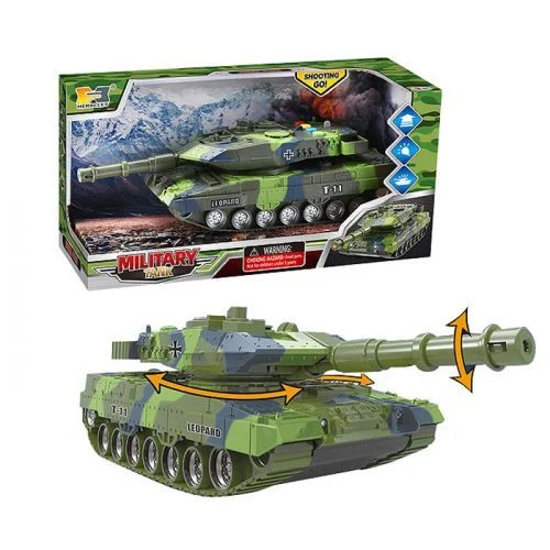 Ця дивовижна іграшка не тільки рухається за допомогою інерції, але також має низку захоплюючих функцій. Повертайте башту, спрямовуйте дуло вгору та вниз, відтворюючи реалістичні бойові сценарії. Оснащений світловими та звуковими ефектами: звуки пострілу, працюючий двигун і навіть фрази англійською мовою.