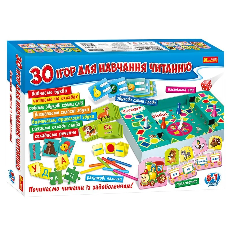 Великий набір. "30 ігор для навчання читанню" 12109098 української торгової марки Ranok Creative, виконаний українською мовою, стане чудовим подарунком як для дівчинки, так і для хлопчика старше п'яти років. Якщо Ваша дитина тільки готується до вступу в школу або вже ходить в перший клас, то такий комплект не залишить його байдужим. У цьому наборі міститься 20 цікавих, розвиваючих ігор з картками, пазлами, 3 варіанти гри на швидкість з настільним полем і фішками, а також неймовірно цікаві, додаткові завдання на логіку. Виконання завдань у формі гри допоможе дитині вдвічі швидше навчитися розпізнавати букви і читати слова. У наборі передбачені спеціальні картки з питаннями і безліч додаткових атрибутів - всього 30 захоплюючих настільних ігор. Така настільна гра допоможе дитині розвинути здатність до обчислень, прокачати просторове мислення.