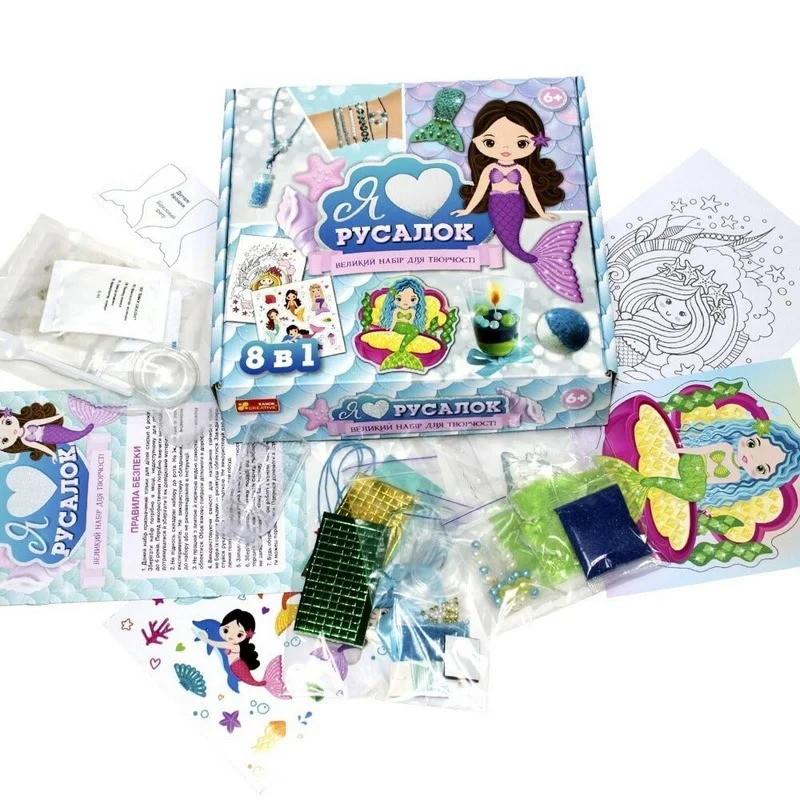Створюємо 8 творчих поробок власноруч. Чудовий подарунок до свят. Запрошуємо тебе у світ натхнення і загадкових чарівних русалок. За допомогою цього набору діти зможуть самостійно зробити творчі поробки. А ще в цьому великому наборі для творчості є релакс-розмальовка і яскраві наліпки! У наборі є все необхідне для створення творчих поробок.