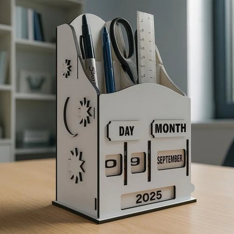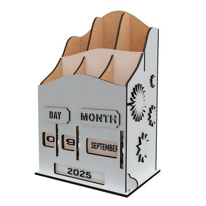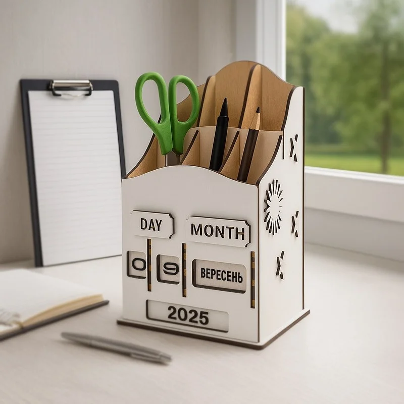 Це не просто органайзер для ручок і канцтоварів. Стильний, з вінтажною ноткою вічний календар від Fabrika Decoru, який стане справжньою окрасою вашого столу. Він послужить і функціональним аксесуаром, і оригінальним подарунком для близьких. Забудьте про набридлі кубики! Унікальний механізм на коліщатках дозволяє встановлювати дату — день, місяць і рік — простим обертанням. Керувати часом ще ніколи не було так просто!