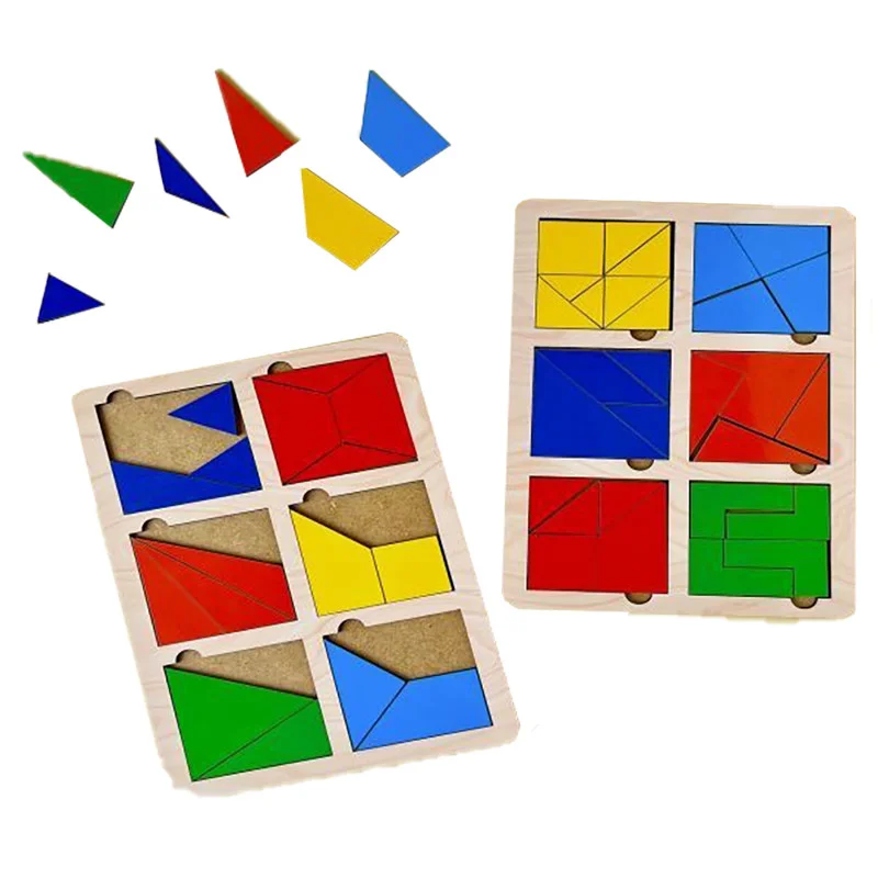 Гра включає в себе два планшети, на кожному з яких розташовано по 6 квадратів. Квадрати розділені на 3 і 4 частини різних форм. Складаючи квадрати з різнокольорових шматочків різної форми, дитина виконує кілька видів робіт, неоднакових за змістом і ступенем складності. У процесі гри дитина знайомиться із сенсорними еталонами форми та кольору, співвідношення цілого та частини, вчиться розбити складне завдання на кілька простих, створюючи алгоритм гри.
