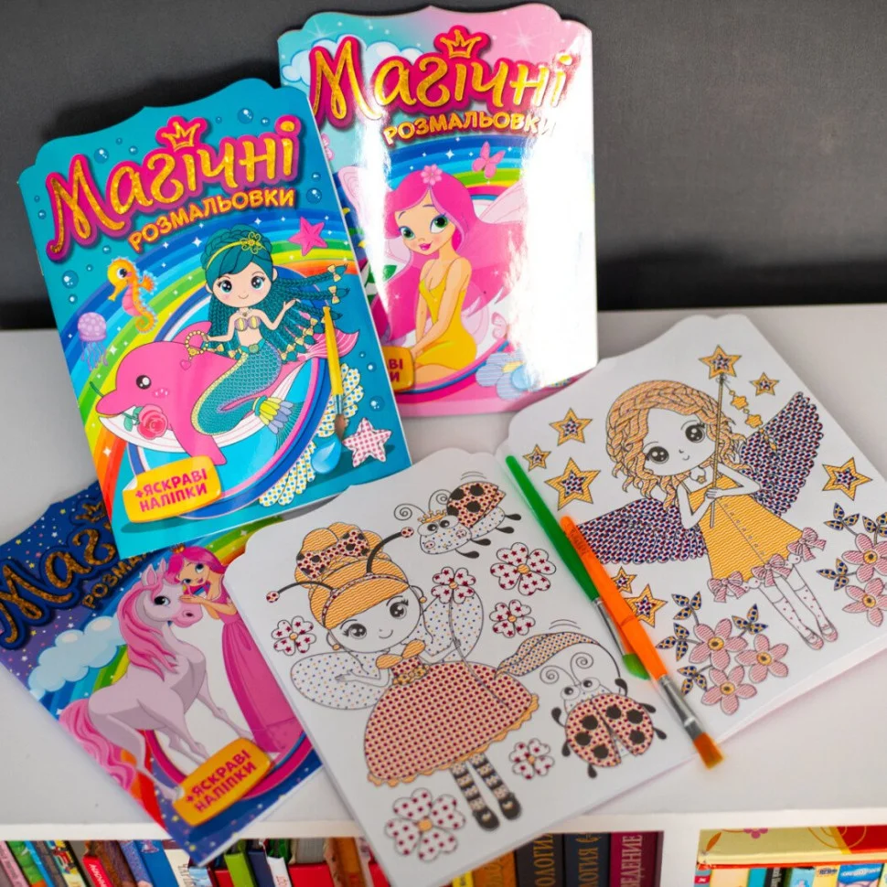 У наборі 8 малюнків, які оживають від дотику води. Після розфарбовування готові зображення можна прикрасити яскравими фігурними наліпками, додаючи ще більше фантазії та настрою.