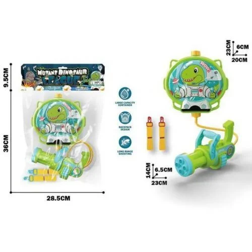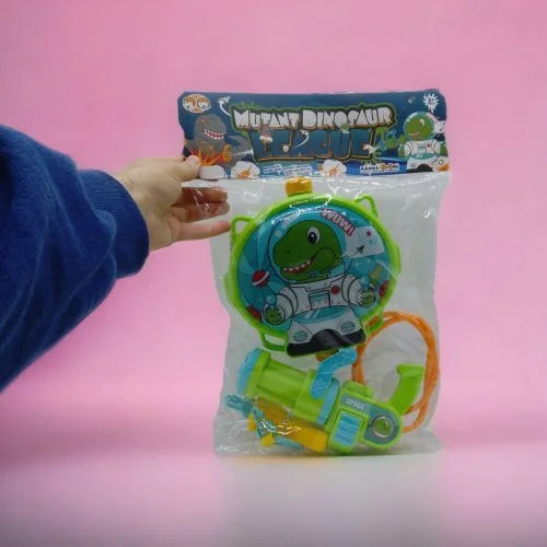 Водний пістолет із рюкзаком-балоном "Динозавр космонавт" - це захоплива іграшка для дітей. Бластер виконаний у формі кулемета та приєднаний до рюкзака-балону, який служить резервуаром для води. Іграшка оснащена помповим механізмом, що дозволяє створювати потужні струмені води для веселих водних битв.