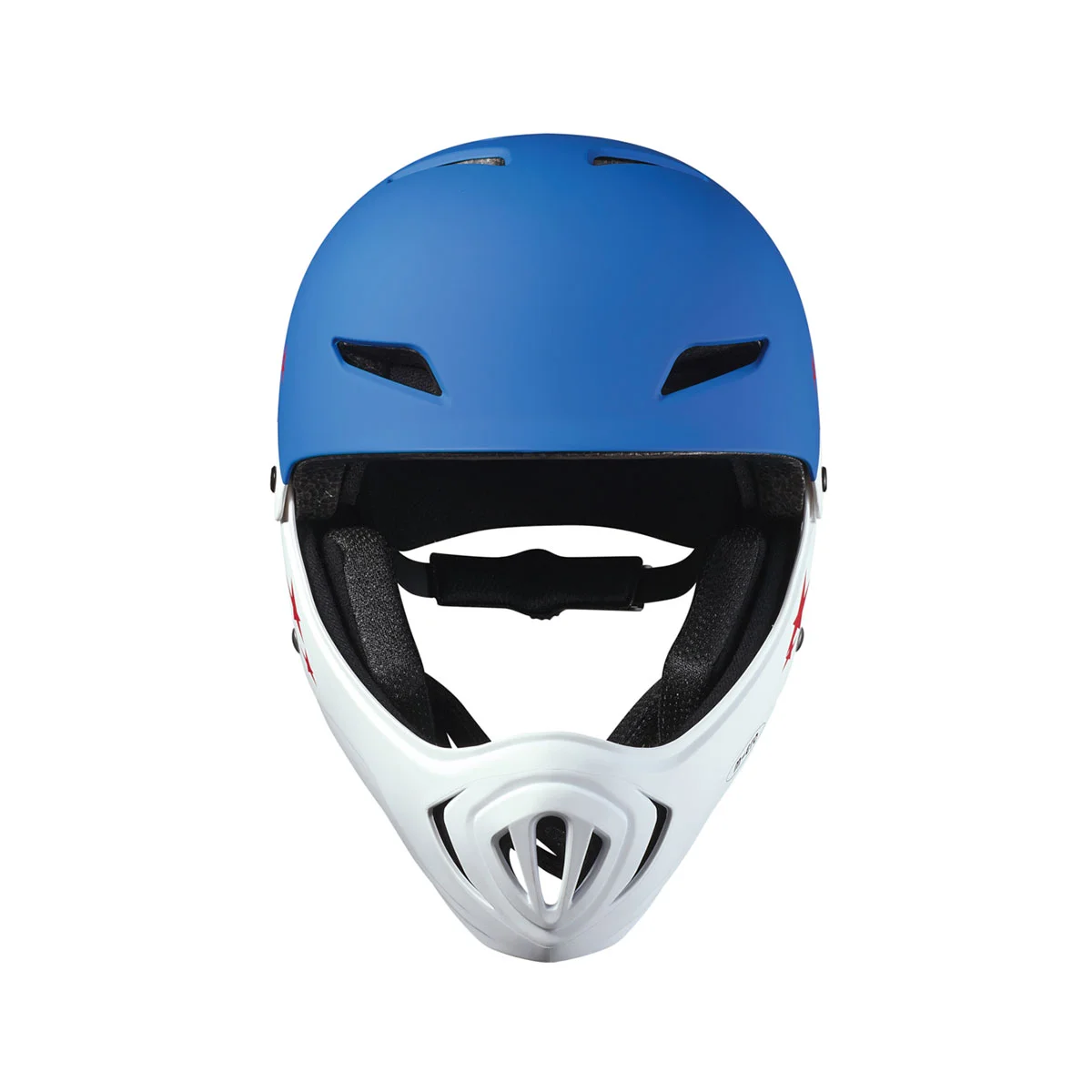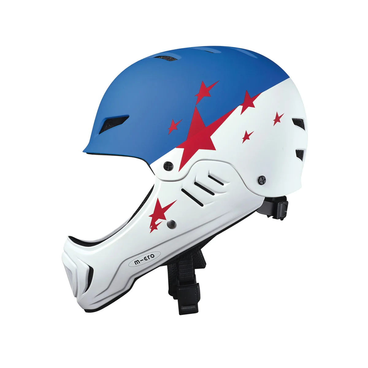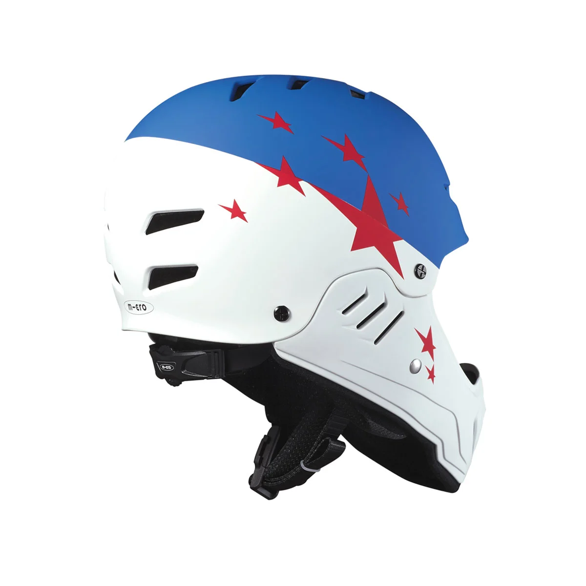 Захисний гоночний шолом MICRO - БІЛО-БЛАКИТНИЙ не тільки виглядає круто, але й забезпечує повний захист обличчя, голови, підборіддя та рота.
