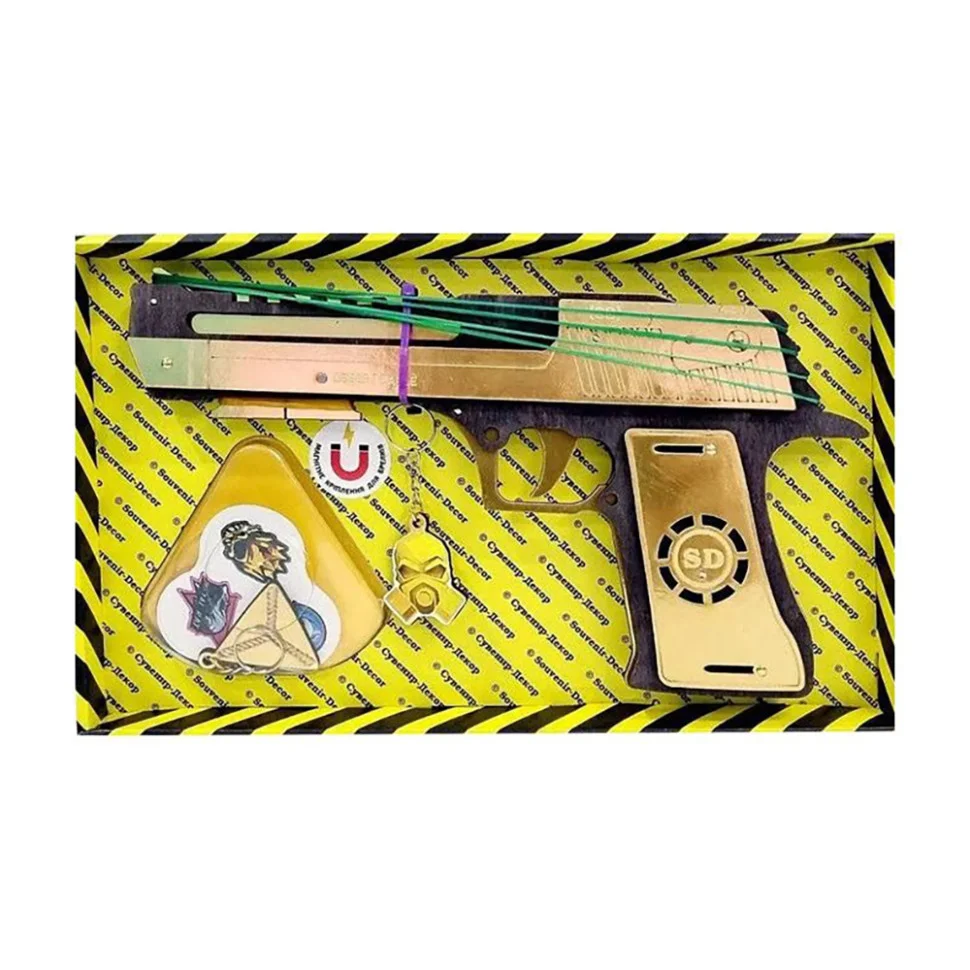 Дерев'яний пістолет у зібраному вигляді. Всі деталі продумані і виконані з екологічних матеріалів. Іграшка стріляє гумками для грошей (гумки є в комплекті), так само в наборі є 2 брелоки і наклейки. Розмір зброї 25х13х2 см.